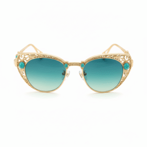 - Gemstone Accents: Round or oval turquoise (or imitation turquoise) stones are symmetrically set at the cat-eye tips of the frame and the nose bridge connection. The striking blue stones create a strong visual contrast with the gold filigree, enhancing the sense of exotic royalty.