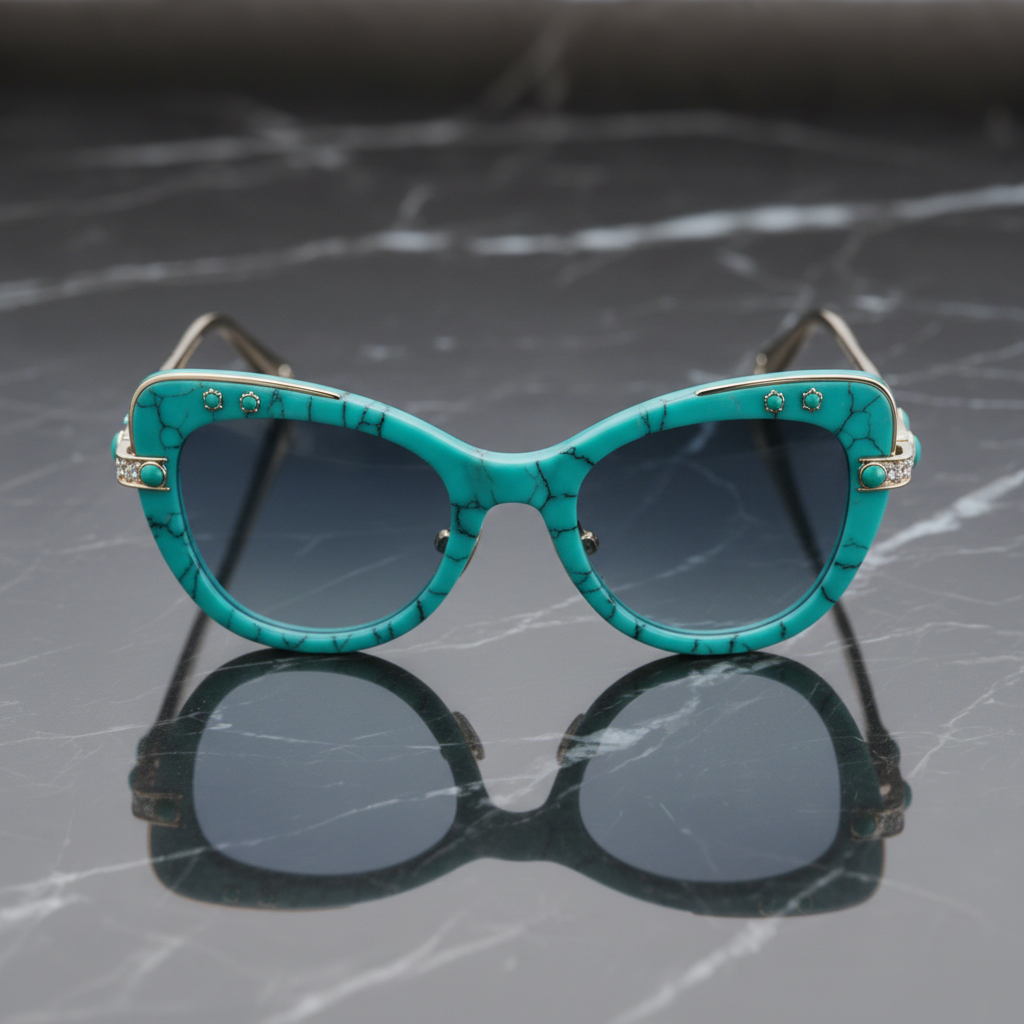 This series is a multi-style eyewear collection, encompassing the vintage grand square frame, the elegant round semi-rim frame, and the alluring Cat-Eye sunglasses. All frames utilize a combination of eco-friendly high-density acetate and premium alloy metals. Acetate: Featuring either the natural “matrix” crackle effect of turquoise acetate (Square/Cat-Eye models) or a pure, smooth, rounded cyan acetate (Round model). Metal: Metal components are finished in either K Gold, Rose Gold, or Rhodium-plated Silver, depending on the style.