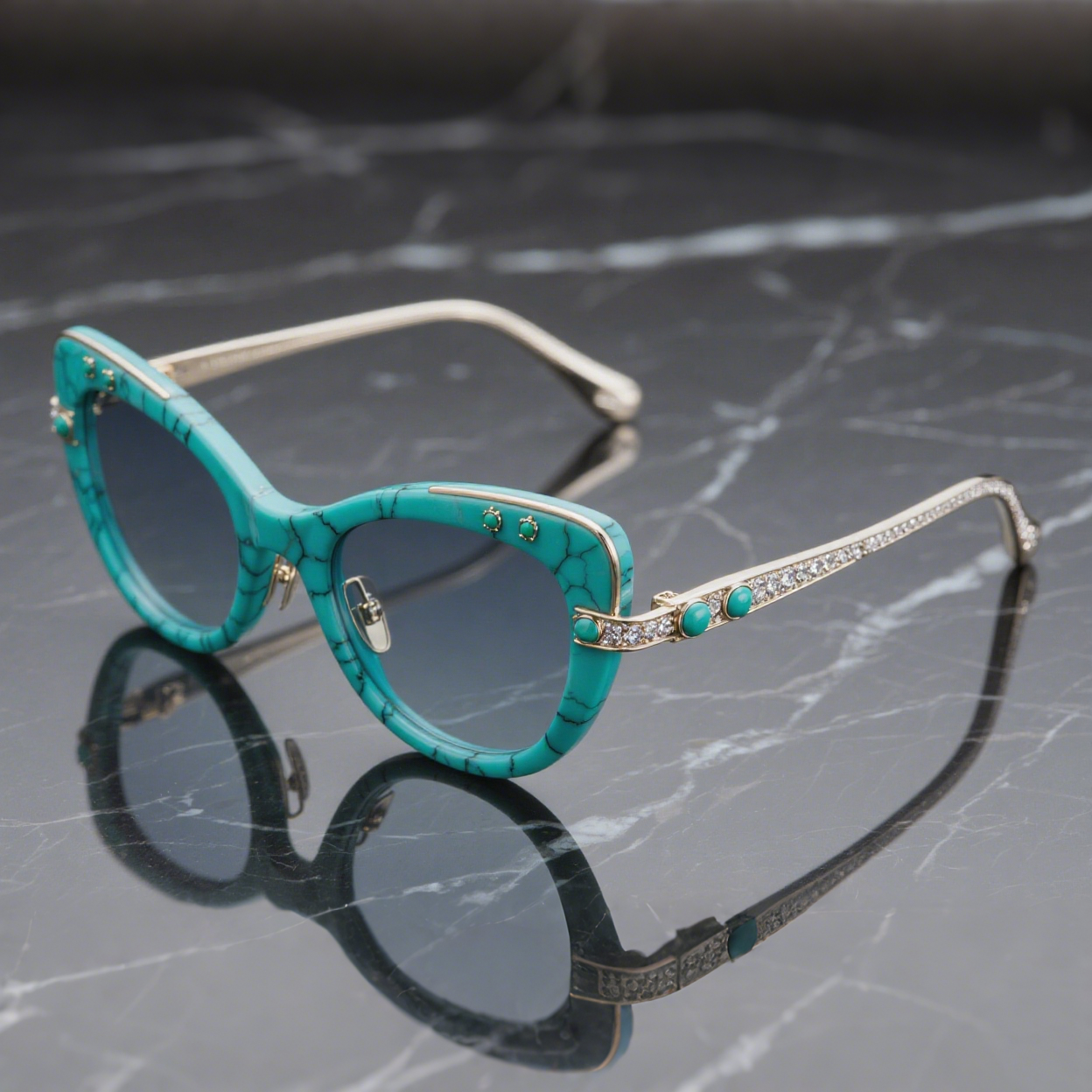 This series focuses on refined material contrast and diverse jewelry craftsmanship: Luxurious Gemstone Elements: The temples of the Square and Cat-Eye models are the core of the craftsmanship. They feature exquisite hand-setting, either utilizing Baroque-style filigree to hold crystals, or by employing rows of micro-set crystals along the slender temples, pushing the eyewear’s artistic value to the extreme. Material and Form Tension: The Round semi-rim model creates a distinct contrast between the rounded, saturated cyan “browline” acetate and the delicate silver metal circular rim. The juncture between the acetate and metal is treated to be smooth and sculptural, highlighting the minimalist elegance and geometric beauty of modern design. Uniqueness in Detail: The turquoise crackle acetate on the Square and Cat-Eye models ensures the uniqueness of every single matrix pattern. All metal joints and polishing techniques meet the highest luxury standards, ensuring both comfort for the wearer and structural stability.